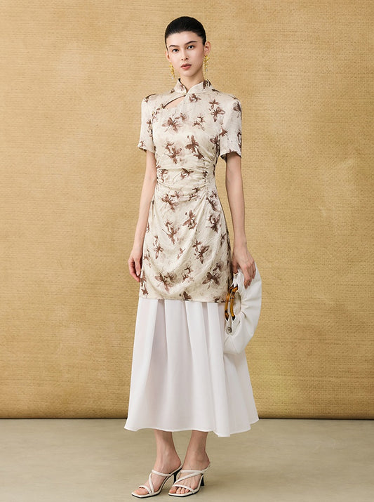 HECO Chinese Style Stand Collar Cut-out Pleated Short Cheongsam Dress - BIRD.