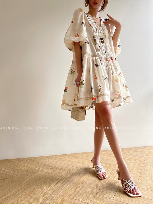 Aconiconi Luxury French Style Printed Puff Sleeve Loose Short Chic Dress- Eden Whisper