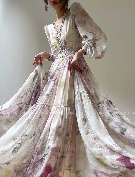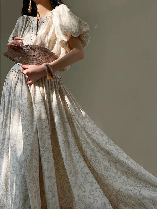 Aconiconi Luxury French Retro V-Neck Printed Puff sleeves Long Dress-Rhine Girl