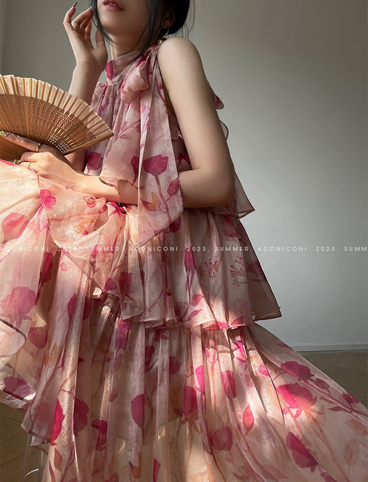 Aconiconi Luxury layered Floral Print Halter Neck Holiday Dress- Aiyu