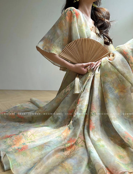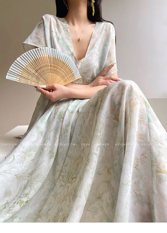 Aconiconi Luxury French Printed Loose Long Chiffon Summer Dress- Green Field Sunny Wind