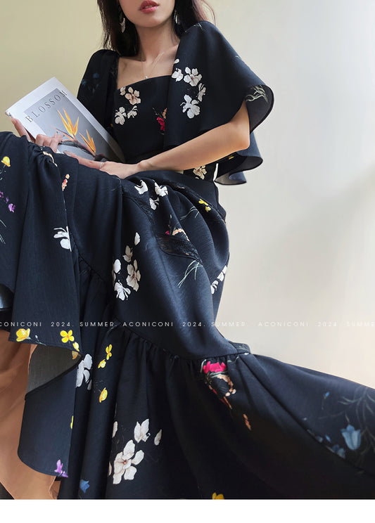 Aconiconi's Elegant Square Collar Flying Sleeve French Long Dinner Dress- Moonlit Night Flower