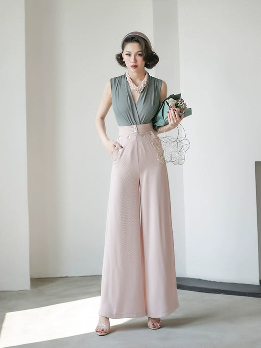 Le Palais Vintage Elegant Retro Pink Drape High Waist Wide Leg Pants-Genny.