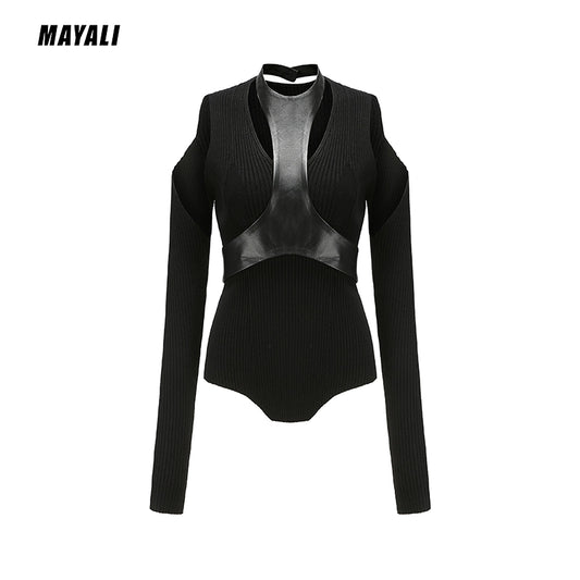 MAYALI 22AW Fall/Winter V-neck, off-the-shoulder halterneck knit top, slim long-sleeved original personality niche