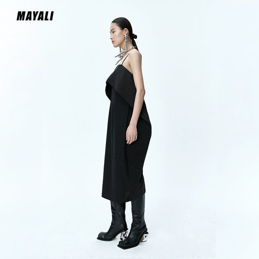 MAYALI Fall/Winter Simple Black Sleeveless Fold Long Slip Dress - Frsw