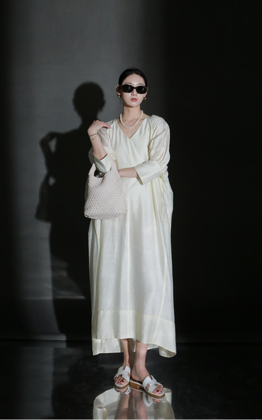 PIAOIN French lustrous tencel oose pleated V-neck dress- ROSE