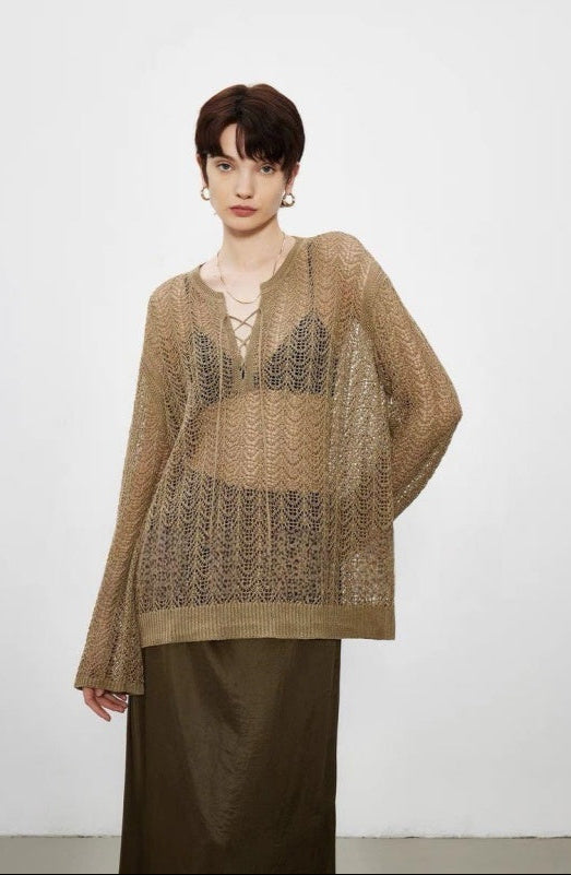 PIAOIN light luxury cut-out lace-up yarn knitted blouse women's loose Tencel jacket -WILLOW