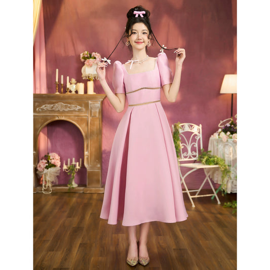 pink satinsquare neck luxury high-endarge swing midi skirt dress - Leiil