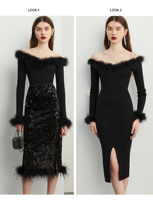 Fall autumn sexy off-shoulder classic black feather top dress - Iwa
