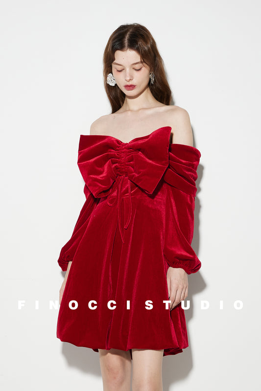 Red Velvet large Bow Off Shoulder Short holiday party Dress - Macy