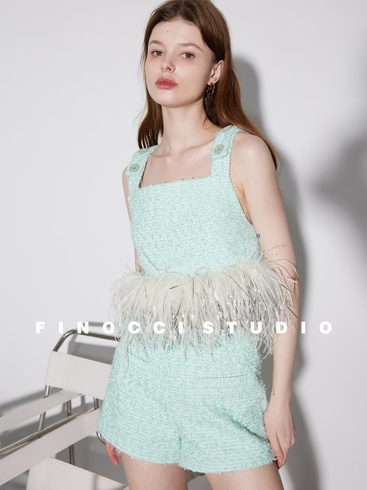 high-end autumn imported tweed silver silk ostrich bird feathers cropped top + shorts set