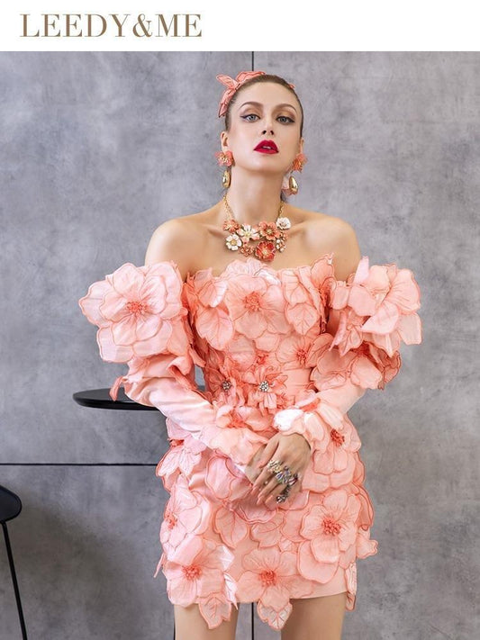 LEEDY&ME new one-shoulder print short hip folds flower cocktail sexy dress - Rumio