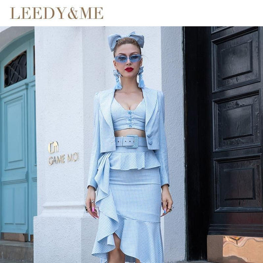 New autumn deep V-neck lace sexy four-piece suit checkered skirt suit - Bilqe