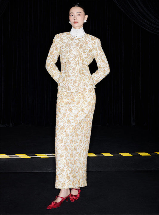 M essential Mackay gold banner jacquard crochet embroidery tunic coat - furbu.