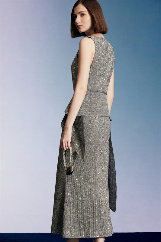 PURITY Elegant beaded top sleek sequin straight skirt- Sisal