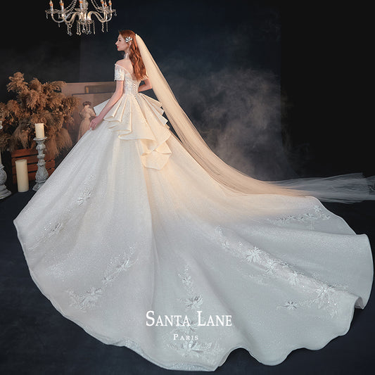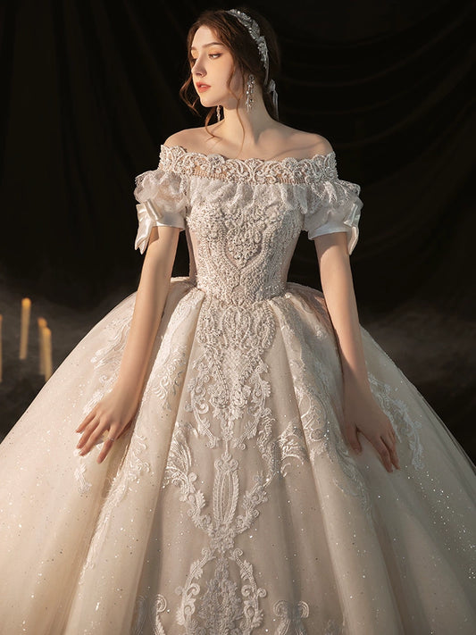 Bride off shoulder high-quality textured lace wedding dress - Garden of Eden