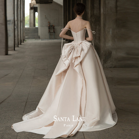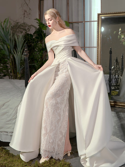 Satin dress new bride French one-shoulder palace style- Ocean