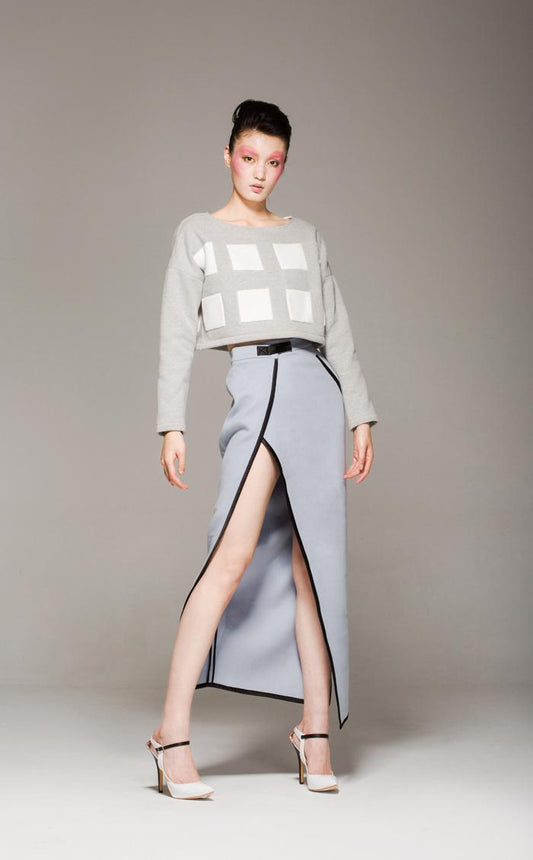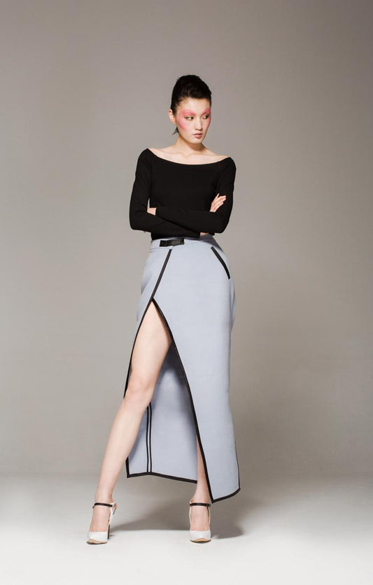 Wool gray edging high waist woolen slit skirt- Reli