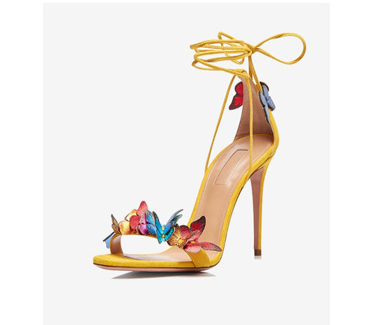 Early spring sandals feature a fine heel, an open toe, and a lace-up- Poli