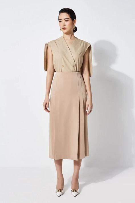 Camel Long puffy sleeve with drappes midi pencil skirt dress- Livet