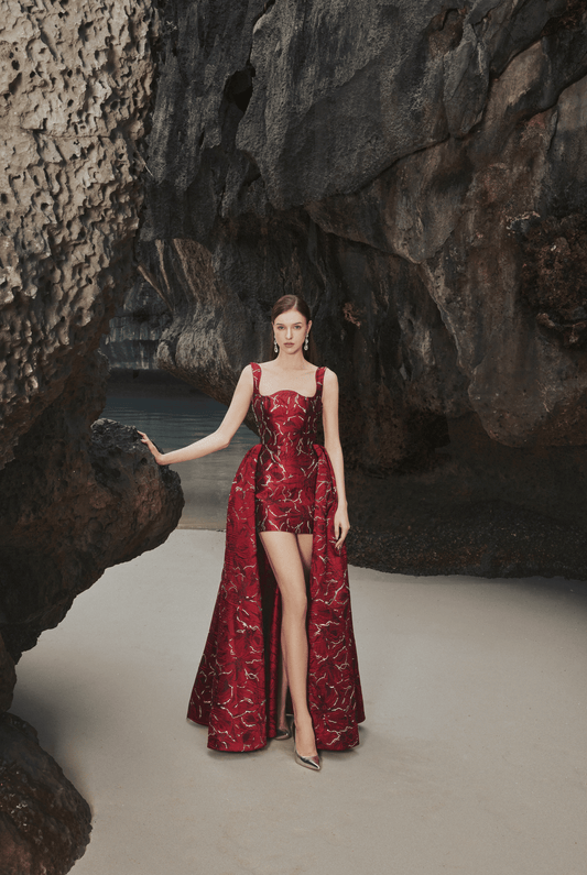 Tracy Studio luxury Floral Crystal Embellished Long Back Cape Flap Evening Dress - Takashi