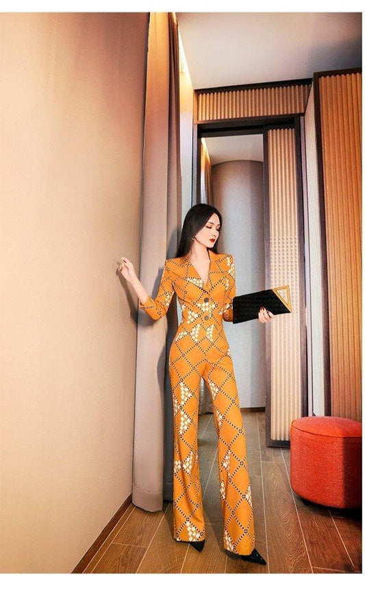 VJE spring printed suit collar long-sleeved jumpsuit - Pioli
