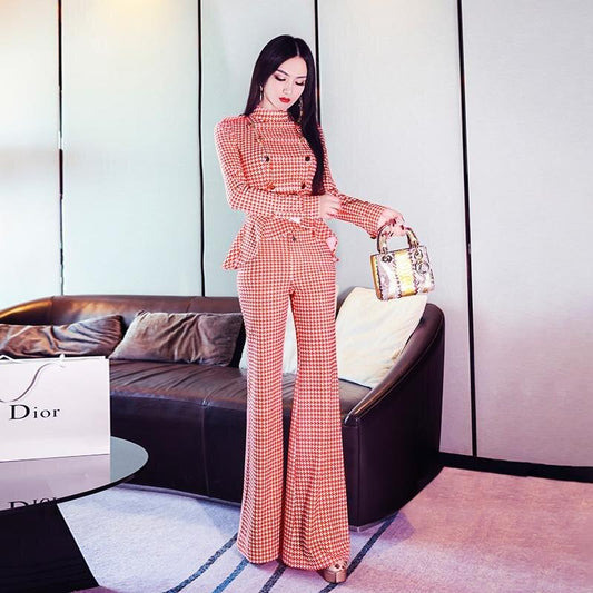 VJE spring hounds tooth military double-breasted wide leg flared pants two-piece suit- Olas