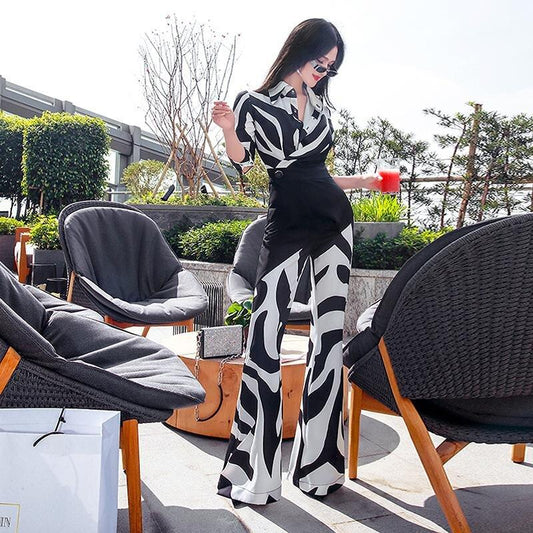 VJE Spring Shirt Collar Jumpsuit Black and White Printed Zebra Pattern Long Sleeve Jumpsuit - Nala