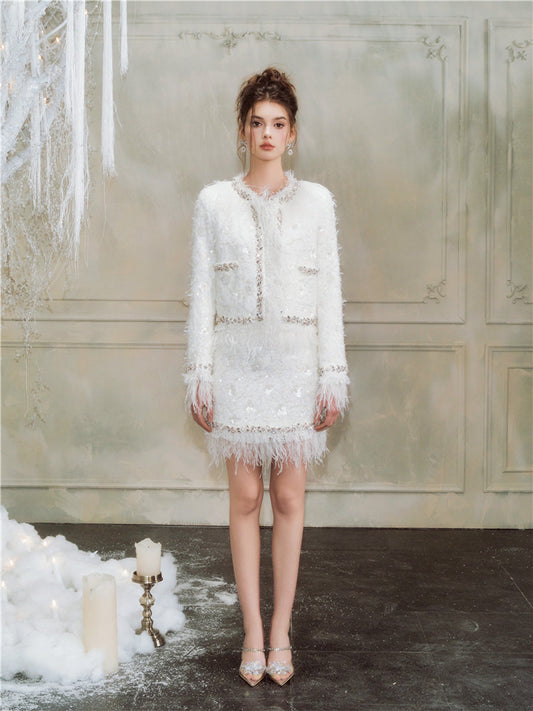 Wardrobes By Chen Elegant White Feather Short Jacket Short Skirt-Serene