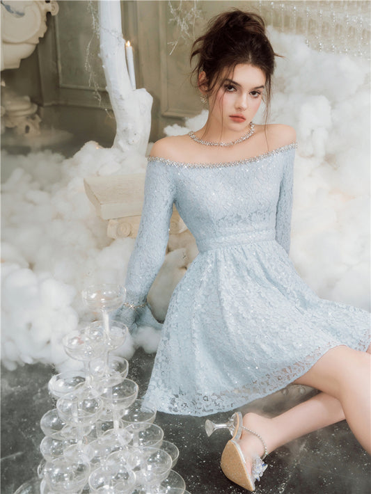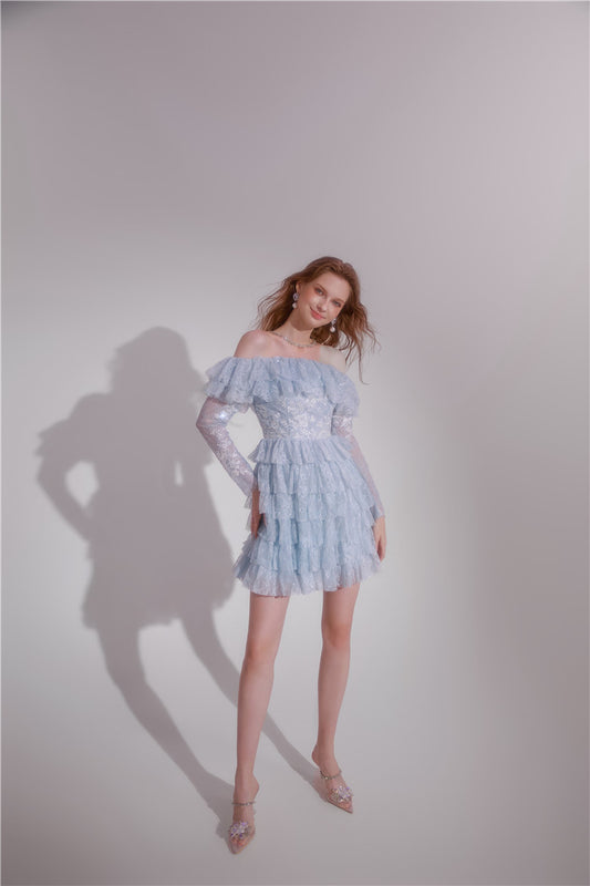 Wardrobes by Chen Blue off shoulder long sleeve Ruffle layer lace Dress-Vee