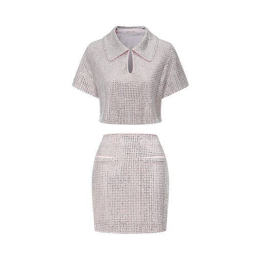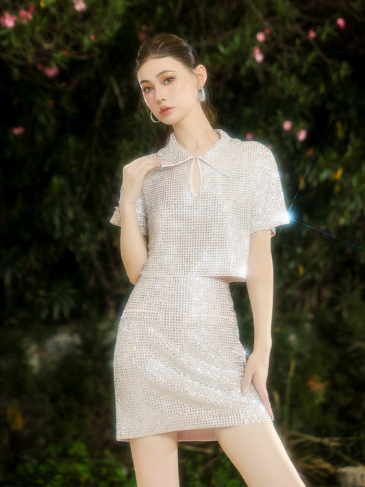 Wardrobes by Chen sequin Lilac Shorts Sleeve Crop Top + Short Skirt-JUICY