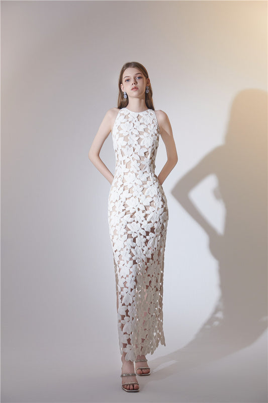 Wardrobes by Chen White bridal French lace body con slit Dress-SIA
