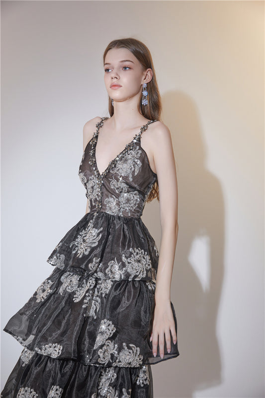 Wardrobes by Chen Elegant Black V-Neck Sleeveless Sequin Diamond Dress-PA
