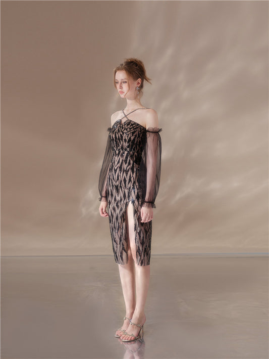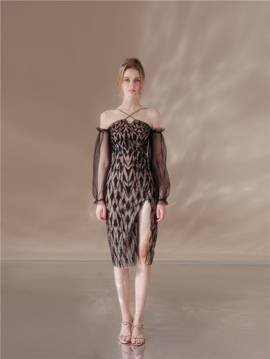 Wardrobes by Chen Elegant Long Sleeve Diamond Short Jacket/Slim Fit Dress-Bella