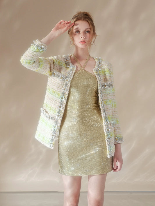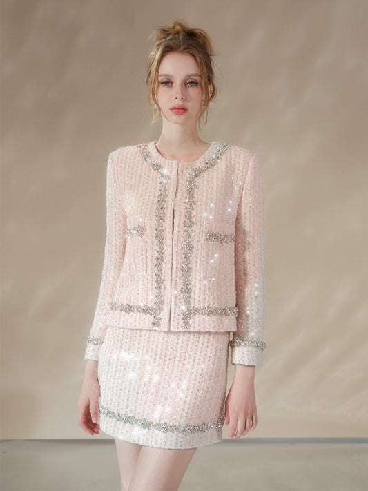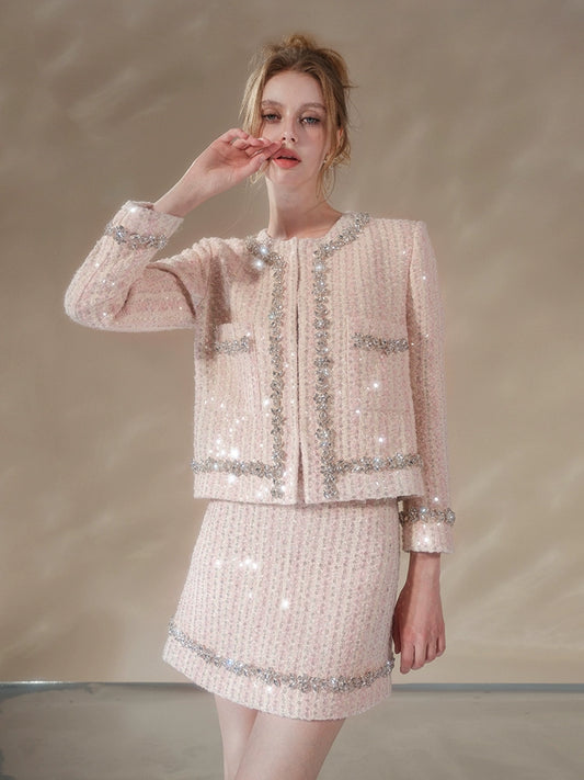 Wardrobes by Chen Luxury pastel Pink Diamond Trim sequin tweed Jacket/ Skirt-Shasha