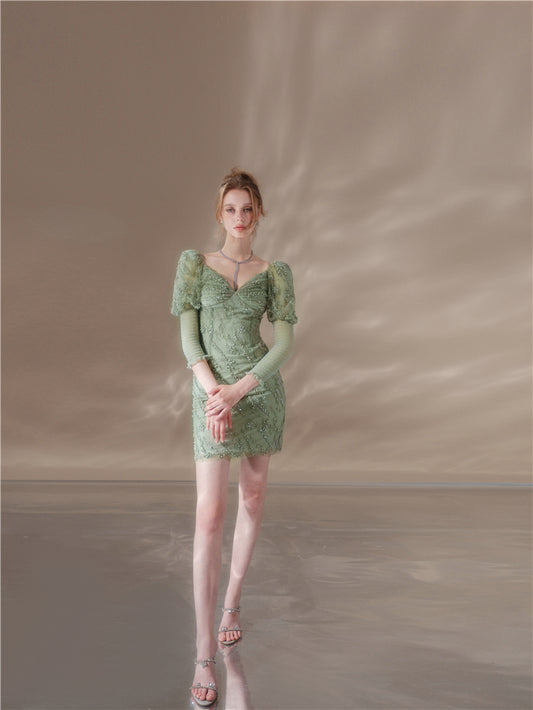 Wardrobes by Chen Luxury Green Embroidered Beaded Long Sleeve Dinner Dress-Shaw