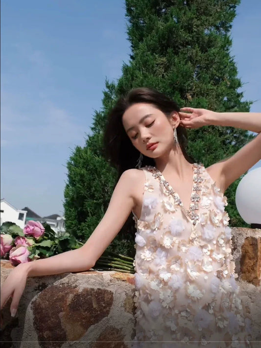Wardrobes by Chen Elegant Pink Sleeveless V-Neck Floral applique Embroidered Dress-Chase