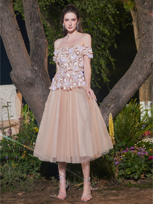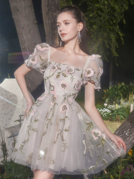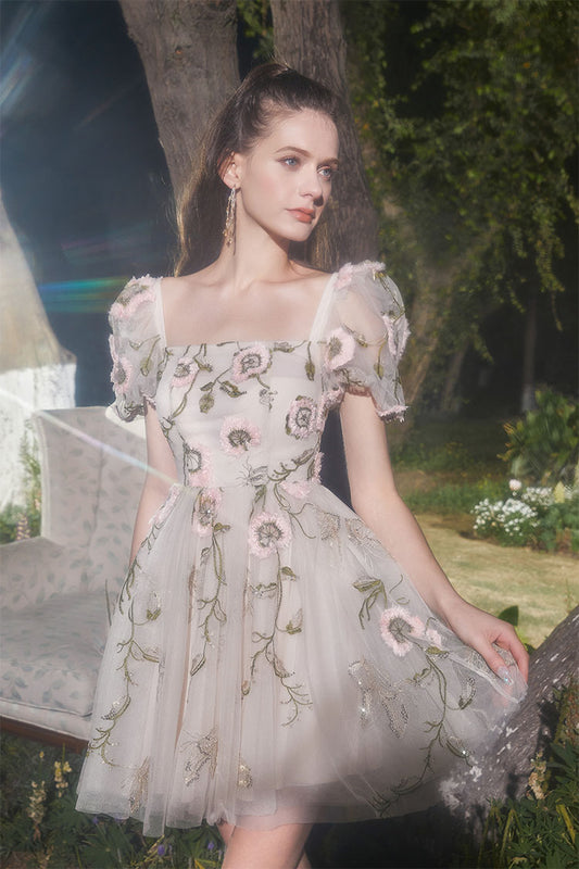 Wardrobes by Chen Elegant Short Sleeve Flower Embroidered midi tulle Dress-Vickie
