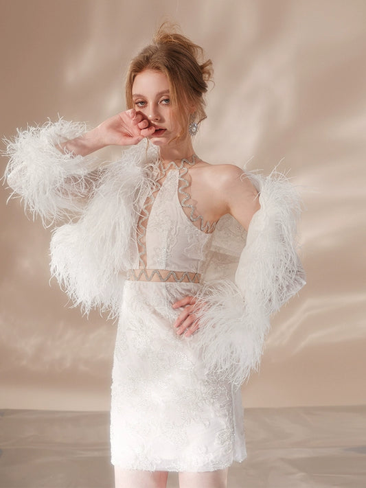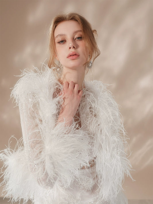 Wardrobes by Chen Luxury White bridal Tulle Ostrich Tassel Jacket dress-Dates