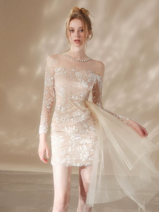 Wardrobes by Chen Luxury Crew Neck Long Sleeve Beaded bridal Dinner Dress-Dami