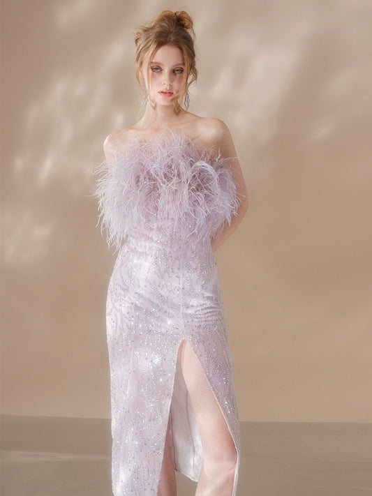 Wardrobes by Chen Luxury Purple Beaded Feather Tassel Dress-Pinty