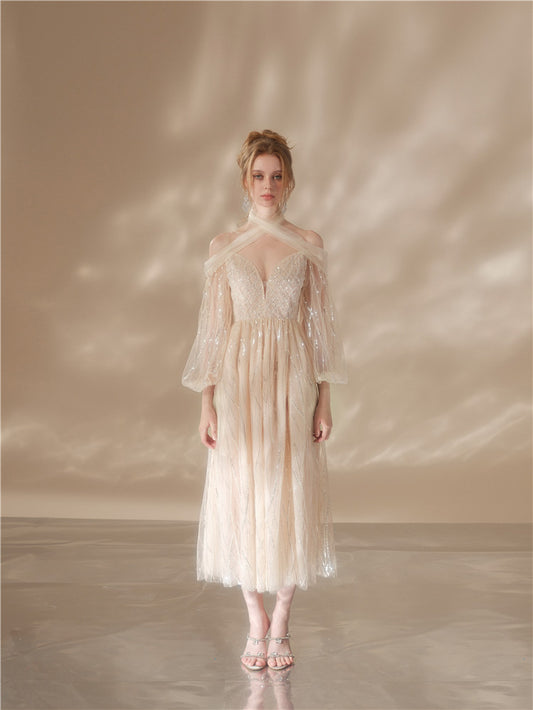 Wardrobes by Chen Elegant halter-Neck Puff Sleeve Pearl Dress- Aida