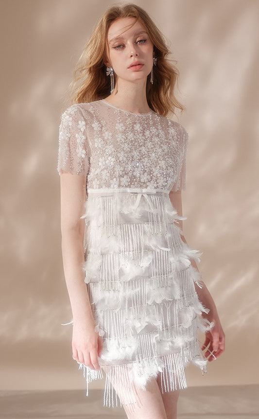 Wardrobes by Chen Elegant Beige Sleeveless Feather Tassel Short Dress-Wemba