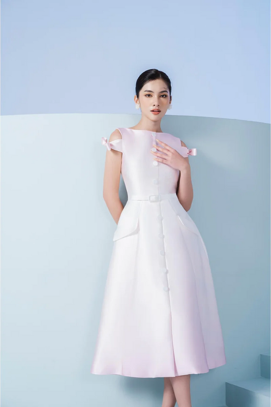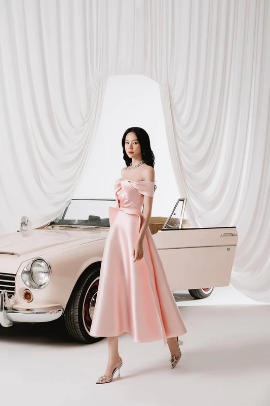 A-line Off-Shoulder Taffeta a fitted waist Midi Dress- Margerida