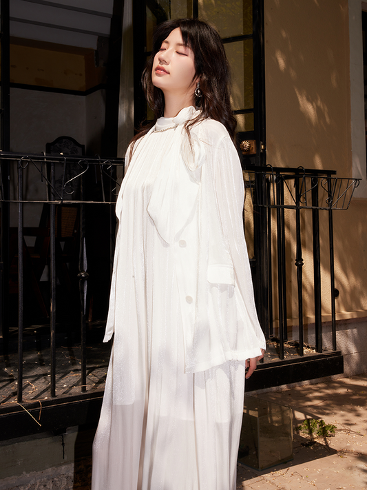 YES BY YESIR | Ye Qians Pleated Romantic Long Dress with Sculptural Ring Ornament-AMELINA.