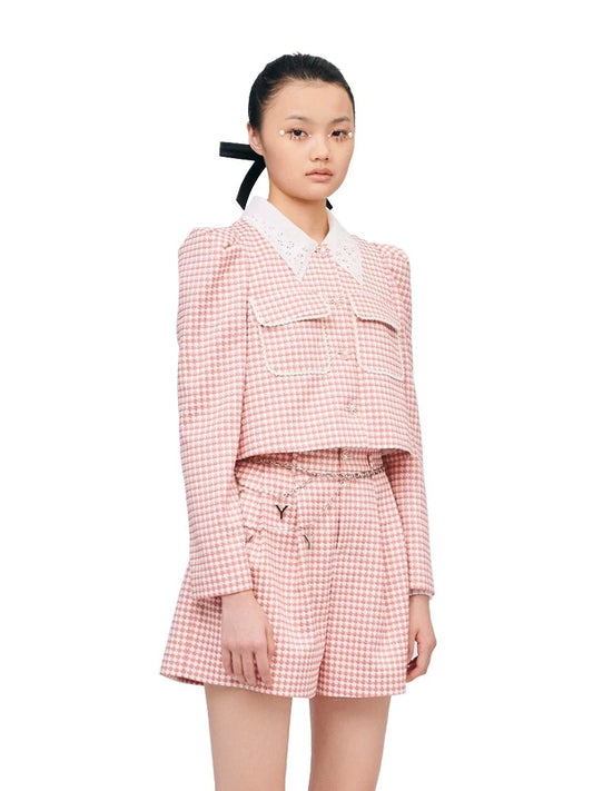 YES BY YESIR designer puff sleeve pink checkered grid short jacket - Aika