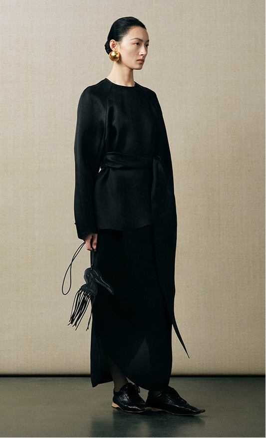 ZHUCHONGYUN black loose pleated satin dress with a belt-SULTY.