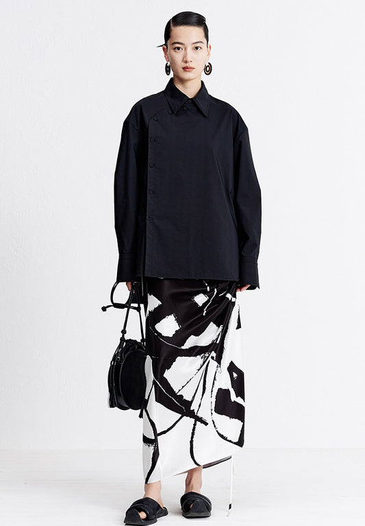 ZHUCHONGYUN black diagonal placket lapel loose straight shirt-LUFFY.