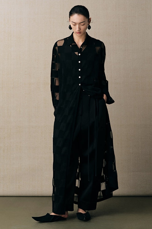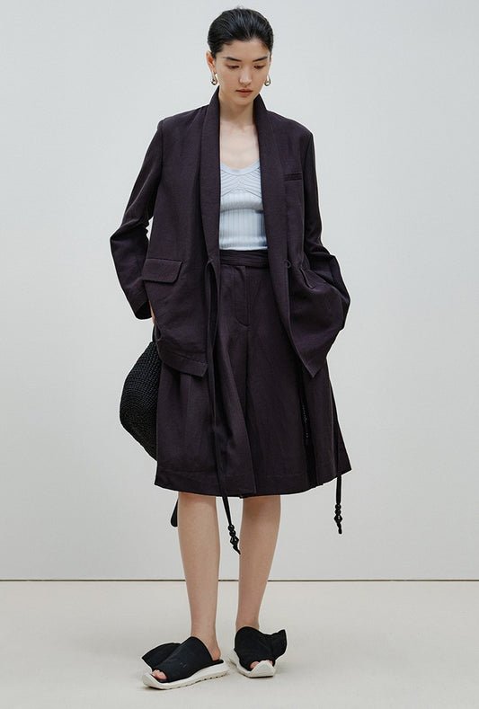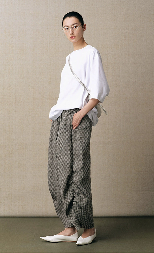 ZHUCHONGYUN linen checkerboard jacket with shirred baggy slacks outfit set-ZIRA.
