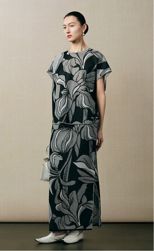 ZHUCHONGYUN Double-knit jacquard botanical print crew neck top and skirt set-ABARAI.